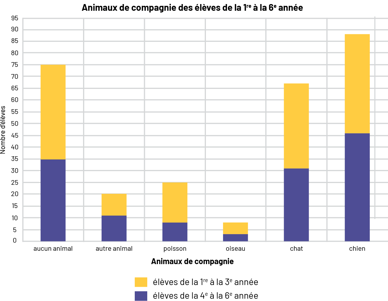 image Le diagramme à bandes empilées s’intitule « Animaux de compagnie des élèves de la première à la sixième année ». L’axe horizontal correspond aux animaux de compagnie tandis que l’axe vertical, gradué de zéro à 95, concerne le nombre d’élèves. La partie jaune de la bande correspond aux élèves de la première à la troisième année, tandis que la partie bleue correspond aux élèves de la quatrième à la sixième année. Aucun animal : bande bleue à 35, bande jaune à 75. Autre animal : bande bleue à onze, bande jaune à 20. Poisson : bande bleue entre 5 et dix, bande jaune à 20. Oiseau : bande bleue entre zéro et cinq, bande jaune entre 5 et dix. Chat : bande bleue à 30, bande jaune entre 65 et 70. Chien : bande bleue à 45, bande jaune entre 80 et 85.