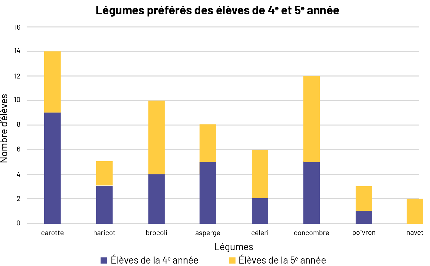 • Est-ce que les résultats présentés dans le diagramme à bandes empilées permettent de répondre à la question initiale? (Oui, on constate que le légume préféré des élèves de 4e année est la carotte et que le légume préféré des élèves de 5e année est le concombre.)