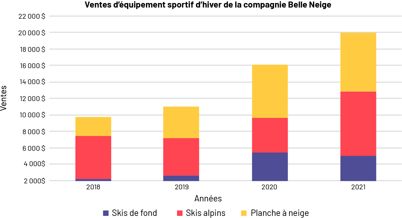 image Le diagramme à bandes empilées s’intitule « Ventes d’équipement sportif d’hiver de la compagnie Belle Neige. L’axe horizontal correspond aux années, tandis que l’axe vertical, gradué de 2 000 dollars à 22 000 dollars, correspond aux ventes. La portion bleue de la bande correspond aux skis de fond, la partie rouge correspond aux skis alpins, et la partie jaune correspond à la planche à neige. 2018 : bande bleue légèrement au-dessus de 2 000 dollars, bande rouge entre 7 000 et 8 000, et bande jaune légèrement sous 10 000. 2019 : bande bleue entre 2 000 et 3 000, bande rouge à 7 000, bande jaune à 11 000. 2020 : bande bleue entre 5 000 et 6 000, bande rouge légèrement sous 10 000, bande jaune à 16 000. 2021 : bande bleue à 5 000, bande rouge à 13 000 et bande jaune à 20 000.