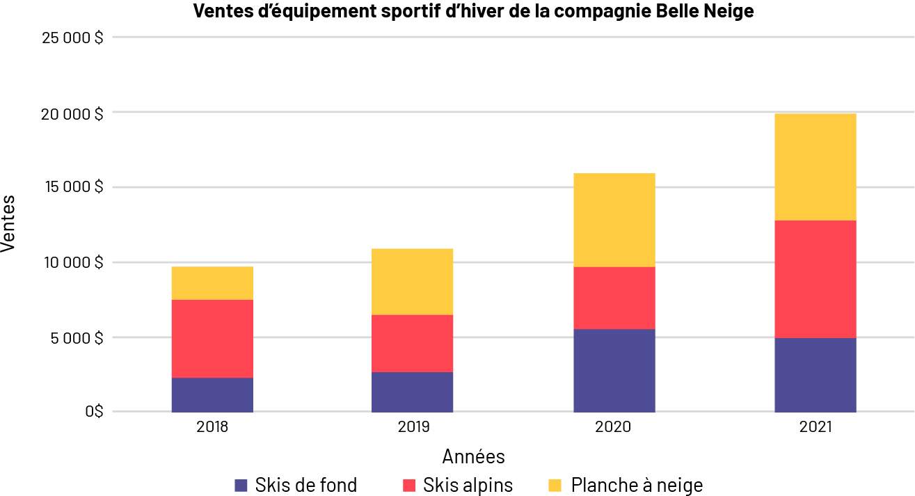 image Le diagramme à bandes empilées s’intitule « Ventes d’équipement sportif d’hiver de la compagnie Belle Neige. L’axe horizontal correspond aux années, tandis que l’axe vertical, gradué de 2 000 dollars à 22 000 dollars, correspond aux ventes. La portion bleue de la bande correspond aux skis de fond, la partie rouge correspond aux skis alpins, et la partie jaune correspond à la planche à neige. 2018 : bande bleue légèrement au-dessus de 2 000 dollars, bande rouge entre 7 000 et 8 000, et bande jaune légèrement sous 10 000. 2019 : bande bleue entre 2 000 et 3 000, bande rouge à 7 000, bande jaune à 11 000. 2020 : bande bleue entre 5 000 et 6 000, bande rouge légèrement sous 10 000, bande jaune à 16 000. 2021 : bande bleue à 5 000, bande rouge à 13 000 et bande jaune à 20 000.