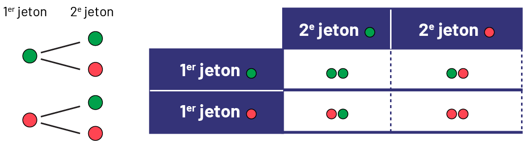 arbre.Premier jeton : vert; deuxième jeton : un jeton vert, un jeton rouge.Premier jeton : rouge; deuxième jeton : un