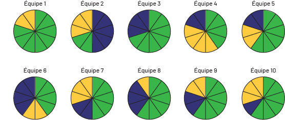 possède six parts vertes, deux parts bleu marine et deux parts jaunes. Et le diagramme de l’équipe dix possède six