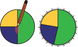 Grouper les élèves en dix équipes. Remettre à chaque équipe un trombone et une copie de l’annexe 6.5A, l’annexe 6.5B et de l’annexe 6.5C. Demander aux élèves de colorier un quart du cercle de l’Annexe 6.5A en jaune, un quart en bleu et une moitié en vert.