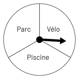 Peu importe la représentation utilisée, les élèves peuvent ensuite voir qu’il y a un seul résultat parmi les 12 résultats équiprobables possibles qui correspond à la sortie à la piscine avec Julie. La probabilité que Véronique se rende à la piscine avec Julie est donc égale à \(\frac{1}{12}\). Pour répondre aux deux autres questions, les élèves peuvent se référer aux 12 résultats possibles ou seulement à la roulette correspondant à la question. Ainsi, la probabilité que Véronique fasse une activité avec Fanny est égale à \(\frac{3}{12}\) ou \(\frac{1}{4}\). La probabilité qu’elle fasse du vélo est égale à \(\frac{4}{12}\) ou \(\frac{1}{3}\).