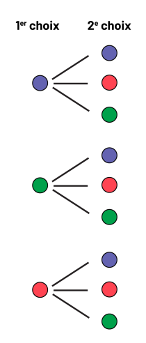 diagramme en arbre possède deux colonnes : premier choix et deuxième choix. Sous premier choix, trois jetons de