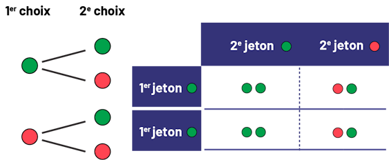 On peut aussi observer qu’il y a deux façons d’obtenir deux jetons de couleurs différentes (V, R et R, V) et deux façons d’obtenir deux jetons de la même couleur (R, R et V, V). La probabilité d’obtenir deux couleurs différentes est donc égale à la probabilité d’obtenir la même couleur. Les résultats des 100 essais présentés dans le tableau plus haut illustrent assez bien ces probabilités (51 résultats R, V ou V, R et 49 résultats R, R ou V, V).