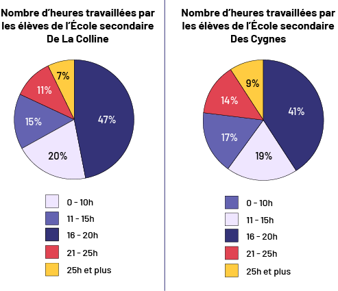 - À l’École secondaire de la Colline, la majorité des élèves travaille combien d’heures par semaine? Qu’en est-il des élèves de l’École secondaire des Cygnes? (À l’École secondaire de la Colline, la majorité des élèves travaille de 16 h à 20 h par semaine. Il en est de même pour les élèves de l’École secondaire des Cygnes.)