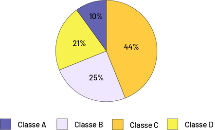 diagramme circulaire est divisé en quatre parts. La part de la classe « A » est de dix pourcent, en violet. La part de