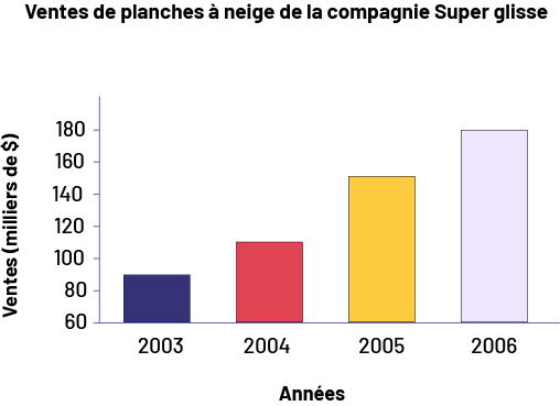Dans ce nouveau diagramme, puisque les longueurs des bandes sont proportionnelles aux ventes, on obtient un portrait plus juste des données. On voit maintenant mieux que les ventes n’ont pas doublé de 2004 à 2005 et on peut noter qu’elles ont presque doublé de 2003 à 2006.