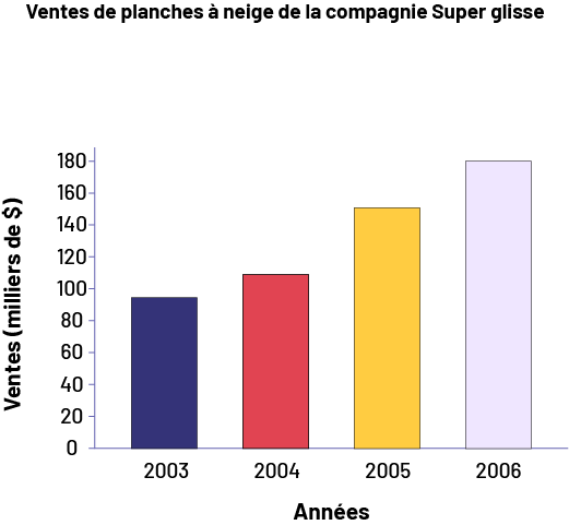 Au cours de l’interprétation des résultats, le personnel enseignant incite les élèves à remettre en question la représentation des données en leur disant : « D’après le diagramme, les ventes semblent avoir doublé de 2004 à 2005. Qu’en est-il? » Après analyse, les élèves devraient être en mesure de reconnaître que, même si la bande jaune est deux fois plus longue que la bande rouge, en réalité, les ventes de 2004 sont d’environ 110 000 $ et celles de 2005 sont d’environ 155 000 $; elles n’ont donc pas doublé. Il importe de souligner que ce diagramme n’est pas incorrect en tant que tel, puisqu’il représente les données de façon exacte. Cependant, il peut laisser de fausses impressions et induire en erreur si nous ne l’analysons pas attentivement.