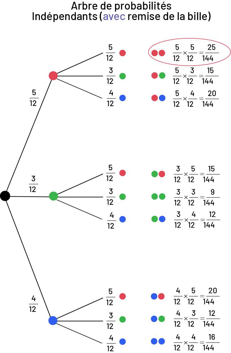 Image Arbre de probabilités indépendant, avec remise de la bille. Si à la première pige on a cinq probabilités sur douze de pigner une bille rouge, et qu’à la deuxième pige, on a cinq probabilités sur douze de piger une bille rouge : cinq sur douze multiplié par cinq sur douze égale 25 probabilités sur 144 de piger deux billes rouges. Cette équation est la seule de l’arbre à être encerclée en rouge. Si à la deuxième pige on a trois probabilités sur douze de piger une bille verte : cinq sur douze multiplié par trois sur douze égale 15 probabilités sur 144 de piger une bille rouge puis une bille verte. Si à la deuxième pige on a quatre probabilités sur douze de piger une bille bleue : cinq sur douze multiplié par quatre sur douze égale vingt probabilités sur 144 de piger une bille rouge puis une bille bleue. Si à la première pige on a trois probabilités sur douze de piger une bille verte, et qu’à la deuxième pige, on a cinq probabilités sur douze de piger une bille rouge : trois sur douze multiplié par cinq sur douze égale 15 probabilités sur 144 de piger une bille verte puis une bille rouge. Si à la deuxième pige on a trois probabilités sur douze de piger une bille verte : trois sur douze multiplié par trois sur douze égale neuf probabilités sur 144 de piger deux billes vertes. Si à la deuxième pige on a quatre probabilités sur douze de piger une bille bleue : trois sur douze multiplié par quatre sur douze égale douze probabilités sur 144 de piger une bille verte puis une bille bleue. Si à la première pige on a quatre probabilités sur douze de piger une bille bleue, et qu’à la deuxième pige, on a cinq probabilités sur douze de piger une bille rouge : quatre sur douze multiplié par cinq sur douze égale vingt probabilités sur 144 de piger une bille bleue puis une bille rouge. Si à la deuxième pige on a trois probabilités sur douze de piger une bille verte : quatre sur douze multiplié par trois sur douze égale douze probabilités sur 144 de piger une bille bleue puis une bille verte. Si à la deuxième pige on a quatre probabilités sur douze de piger une bille bleue : quatre sur douze multiplié par quatre sur douze égale seize probabilités sur 144 de piger deux billes bleues