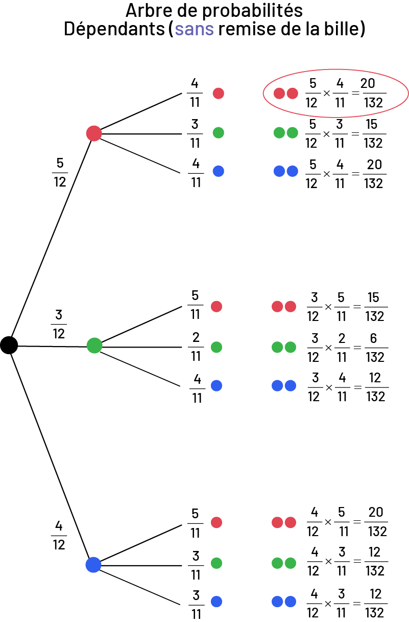 Image Arbre de probabilités dépendant, sans remise de la bille. Si à la première pige on a cinq probabilités sur douze de pigner une bille rouge, et qu’à la deuxième pige, on a quatre probabilités sur onze de piger une bille rouge : cinq sur douze multiplié par quatre sur onze égale vingt probabilités sur 132 de piger deux billes rouges. Cette équation est la seule de l’arbre à être encerclée en rouge. Si à la deuxième pige on a trois probabilités sur onze de piger une bille verte : cinq sur douze multiplié par trois sur onze égale 15 probabilités sur 132 de piger une bille rouge puis une bille verte. Si à la deuxième pige on a quatre probabilités sur onze de piger une bille bleue : cinq sur douze multiplié par quatre sur onze égale vingt probabilités sur 132 de piger une bille rouge puis une bille bleue. Si à la première pige on a trois probabilités sur douze de piger une bille verte, et qu’à la deuxième pige, on a cinq probabilités sur onze de piger une bille rouge : trois sur douze multiplié par cinq sur onze égale 15 probabilités sur 132 de piger une bille verte puis une bille rouge. Si à la deuxième pige on a trois probabilités sur onze de piger une bille verte : trois sur douze multiplié par trois sur onze égale neuf probabilités sur 132 de piger deux billes vertes. Si à la deuxième pige on a quatre probabilités sur onze de piger une bille bleue : trois sur douze multiplié par quatre sur onze égale douze probabilités sur 132 de piger une bille verte puis une bille bleue. Si à la première pige on a quatre probabilités sur douze de piger une bille bleue, et qu’à la deuxième pige, on a cinq probabilités sur onze de piger une bille rouge : quatre sur douze multiplié par cinq sur onze égale vingt probabilités sur 132 de piger une bille bleue puis une bille rouge. Si à la deuxième pige on a trois probabilités sur onze de piger une bille verte : quatre sur douze multiplié par trois sur douze égale douze probabilités sur 132 de piger une bille bleue puis une bille verte. Si à la deuxième pige on a quatre probabilités sur onze de piger une bille bleue : quatre sur douze multiplié par quatre sur douze égale seize probabilités sur 132 de piger deux billes bleues.