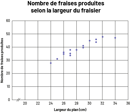 image Le diagramme de dispersion s’intitule « Nombre de fraises produites selon la largeur du fraisier ». Gradué de zéro à 36 avec une coupure entre zéro et 20, l’axe horizontal se nomme « Largeur du plan en centimètres », et l’axe vertical, gradué de zéro à 60, se nomme « Nombre de fraises produites ». La trainée de points débute à 24 sur l’axe horizontal et légèrement sous 30 sur l’axe vertical. Les points demeurent plutôt regroupés jusqu’au dernier, situé à 34 sur l’axe horizontal et entre 45 et 50 sur l’axe vertical.