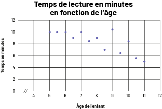image Le diagramme de dispersion s’intitule « Temps de lecture en minutes en fonction de l’âge. Gradué de quatre à douze, l’axe horizontal se nomme « Âge de l’enfant », tandis que l’axe vertical se nomme « Temps en minutes » et est gradué de zéro à douze. Les points montrent une certaine relation négative; le temps a tendance à diminuer lorsque l’âge progresse.