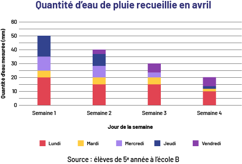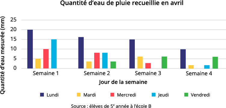 diagramme à bandes multiples verticales est : Quantité d’eau de pluie recueillie en avril.Le titre de l’axe des x est