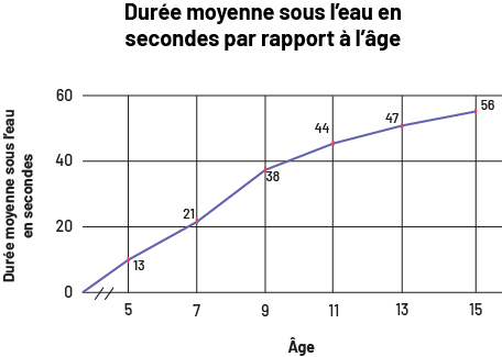 diagramme à ligne brisée s’intitule « Durée moyenne sous l’eau en secondes par rapport à l’âge ». L'axe horizontal se