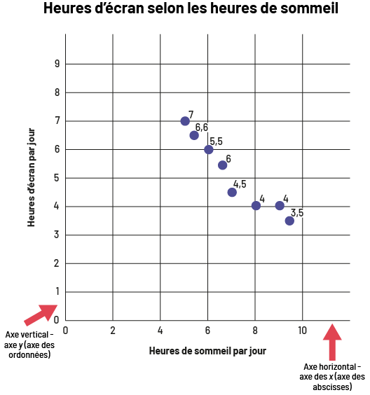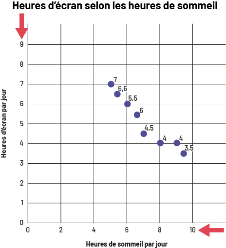 Au cycle intermédiaire, les élèves pourraient utiliser l’un des modes de représentation enseignés aux niveaux antérieurs. Toutefois, elles et ils peuvent aussi utiliser le diagramme de dispersion, le mode de représentation enseigné en 8e année.