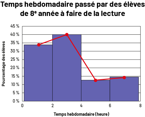 à faire de la lecture ». L’axe horizontal, gradué de zéro à huit, se nomme « Temps hebdomadaire en heures », tandis