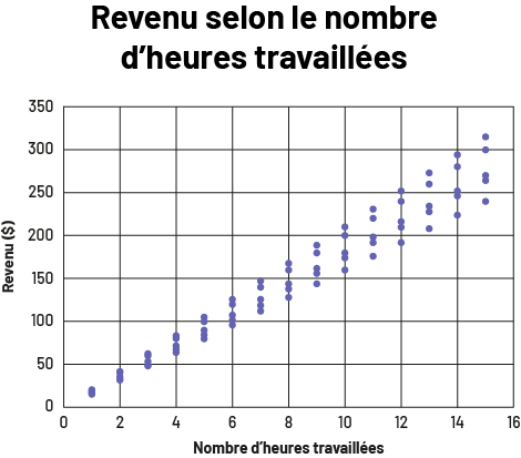 diagramme de dispersion s’intitule « Revenu selon le nombre d’heures travaillées ». Gradué de zéro à 16, l’axe