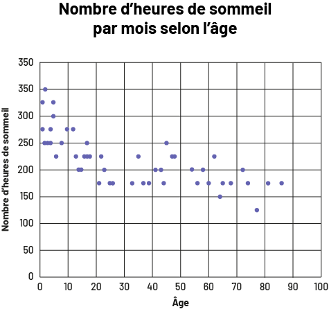diagramme de dispersion s’intitule « Nombre d’heures de sommeil par mois selon l’âge ». Gradué de zéro à cent, l’axe