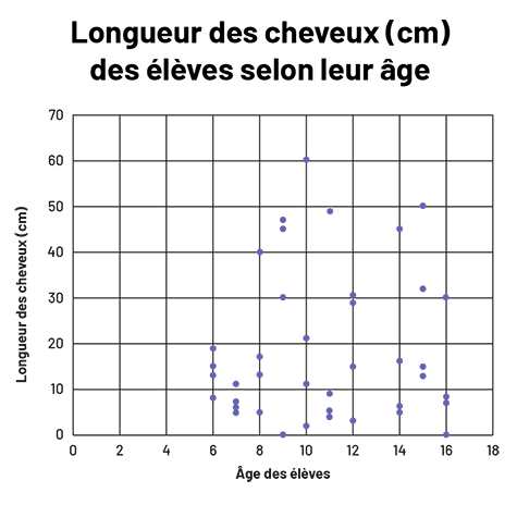 se nomme « Âge des élèves » et est gradué de zéro à 18, tandis que l’axe vertical se nomme « Longueur des cheveux en