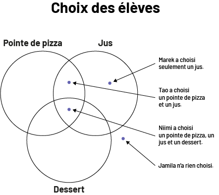 Niimi a choisi une pointe de pizza, un jus et un dessert. » Un point se trouve dans l’ensemble partagé entre pointe de