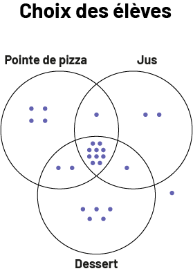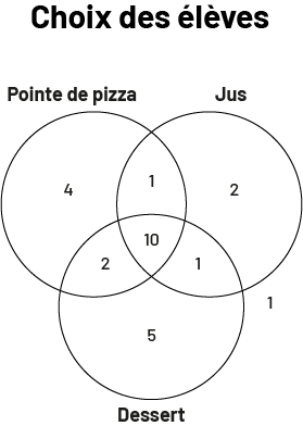 D’après le dernier diagramme, on constate, par exemple, que 10 élèves ont commandé une pointe de pizza, un jus et un dessert, que quatre élèves ont commandé une pointe de pizza seulement et que deux élèves ont commandé une pointe de pizza et un dessert.