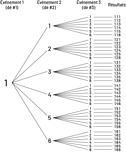 diagramme en arbre élabore tous les scénarios de trois événements. À l’événement un, avec le dé numéro un, il y a le