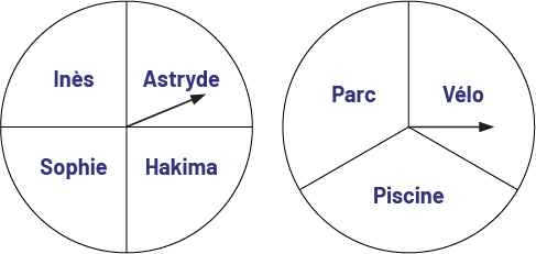 Après avoir déterminé ces probabilités, les élèves peuvent réaliser une expérience de probabilité pour vérifier la vraisemblance de leurs réponses en utilisant deux roulettes comme celles présentées ci-dessus. Elles et ils peuvent aussi placer quatre jetons de couleur différente dans un premier sac et trois jetons de couleur différente dans un deuxième sac. Chaque jeton du premier sac est associé à une des quatre amies et chaque jeton du deuxième sac est associé à une des trois activités. L’expérience consiste alors à piger un jeton de chaque sac et à noter les résultats. Le personnel enseignant doit rappeler aux élèves l’importance d’effectuer l’expérience un nombre suffisant de fois.