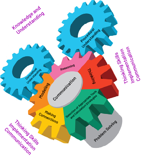 image Infographic. A gear wheel is placed on an axis named 'problem solving'. The gear, which is on this axis, is divided into 5 parts: thinking; selecting appropriate tools and computational strategies; making connections; modeling; and reasoning. All revolving around communication. These five elements allow for: thinking skills, application and communication. On the gears, modelling and reasoning, there is another wheel of conceptual understanding, and a wheel of procedural understanding. This will bring knowledge and understanding.