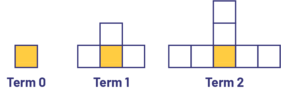 | When analyzing the above growing pattern, it is common for the student to give a description of any term rather quickly. The student explains the pattern without representing it concretely: a first abstraction is then developed. Based on particular terms, the student says that they can describe the 10th term and even the 100th term. However, whatever the position of the term, the explanation sometimes remains for a long time anchored in the process of construction of these particular terms. | In position 0, there is a yellow square. In position 1, there is a yellow square and a group of 3 white squares. In position 2 there is one yellow square and 3 groups of 2 white squares. So, in position 3, there will be one yellow square and three groups of white squares. The term in position 3 will have 3 groups of 3 white squares (3 × 3) + one yellow square which makes 10 in all. In position 10, the term will have 10 groups of 3 white squares (10 × 3) + 1 yellow square, which is 31 squares. |