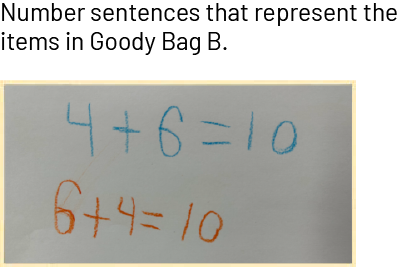 Then ask students to represent the amount of objects in each goody bag using two different number sentences. A number sentence is a symbolic expression that represents a relationship.