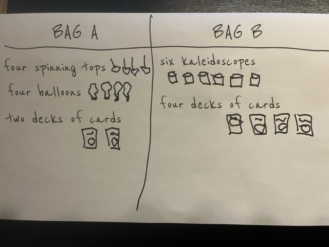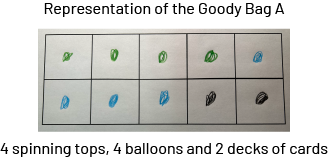 - two goody bags containing 10 elements each (the first bag containing three different types of elements and the second containing two different types of elements)