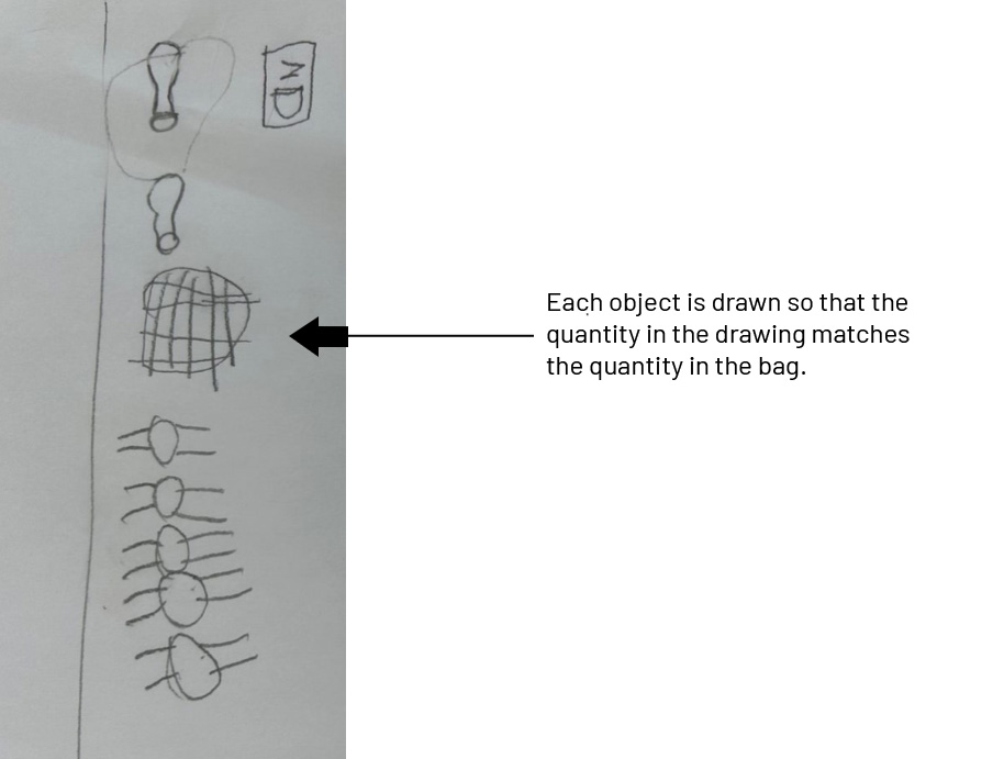 Ask students to suggest a way to represent the contents of the goody bags without using the objects themselves and without using numbers. Most students will suggest drawing the objects. Continue the discussion to find other possible representations.