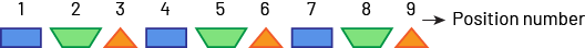 Position: Where each element is located in a pattern, indicated by a number. It is used to help describe the functional relationships in a pattern and to predict the next elements in the pattern without having to extend it. In Pattern A, there is a blue rectangle in the 1st, 4th and 7th position, a green trapezoid in the 2nd, 5th and 8th position, etc. |