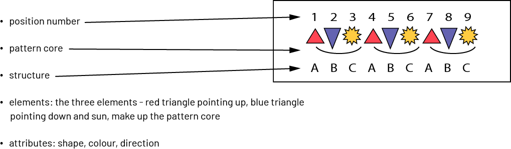 As an example, they may describe the following pattern as follows: "The attributes are shape and position. The pattern has three elements: a triangle pointing up, followed by a triangle pointing down, followed by a sun. The three elements of the pattern always repeat in this order."
