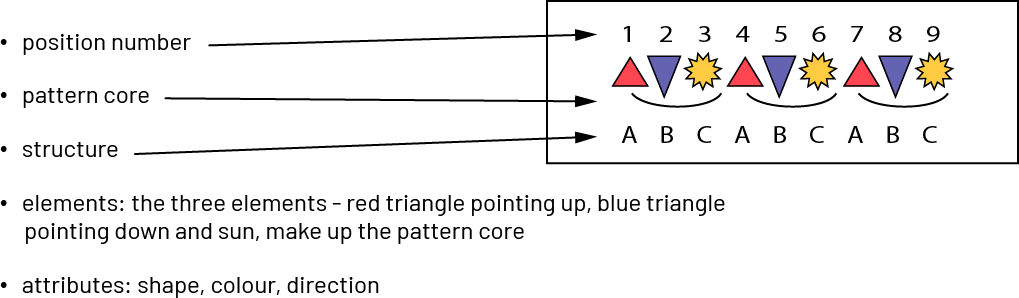 As an example, they may describe the following pattern as follows: "The attributes are shape and position. The pattern has three elements: a triangle pointing up, followed by a triangle pointing down, followed by a sun. The three elements of the pattern always repeat in this order."
