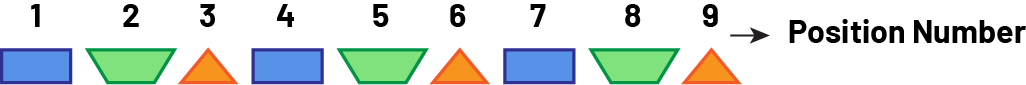 | In Pattern A, there is a blue rectangle in the 1st, 4th and 7th position, a green trapezoid in the 2nd, 5th and 8th position, etc. | In Patterns B and C, each shape has its position: the first shape is in the 1st position, the second shape is in the 2nd position, etc. |