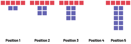 image pattern with growing patterns. Rank one has 5 red vertical cubes and 2 blue cubes below. Rank 2 has 5 red cubes vertical and 4 blue cubes below. Rank 3 has 5 red cubes vertical and 6 blue cubes below. Rank four is empty. Rank 5 has 5 red vertical cubes and 10 blue cubes below.