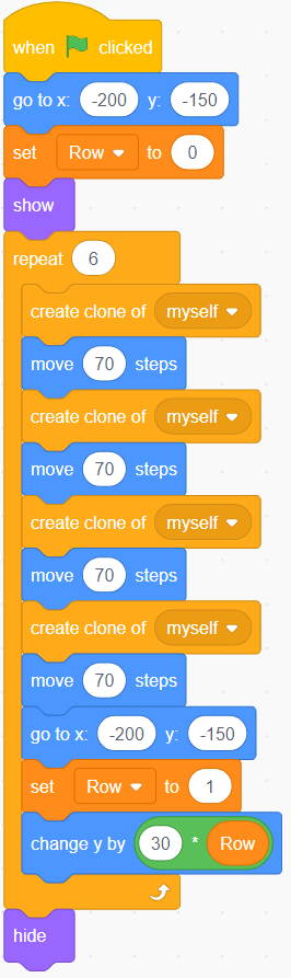 image Blocks of code:6 attached blocks:Events block stating, “starts on green flag when clicked”.Motions blocks stating, “go to x-200 y –150’’. Variables block stating ‘’set row to zero’’. Looks blocks stating ‘’show’’. Events block stating ‘’repeat six”. Inside are 11 nested blocks. Controls block stating “create clone of myself’’.Motions block stating “move ‘70’ steps”.Controls block stating “create clone of myself’’.Motions block stating “move ‘70’ steps”.Controls block stating “create clone of myself’’.Motions block stating “move ‘70’ steps”.Controls block stating “create clone of myself’’.Motions block stating “move ‘70’ steps”.Controls block stating “go to x: ‘-200’ y” ‘-150’”. Variables block stating “change row by ‘1’.Motions block stating “change y by ‘30’ motions block ‘row’”Looks block stating ‘hide’.