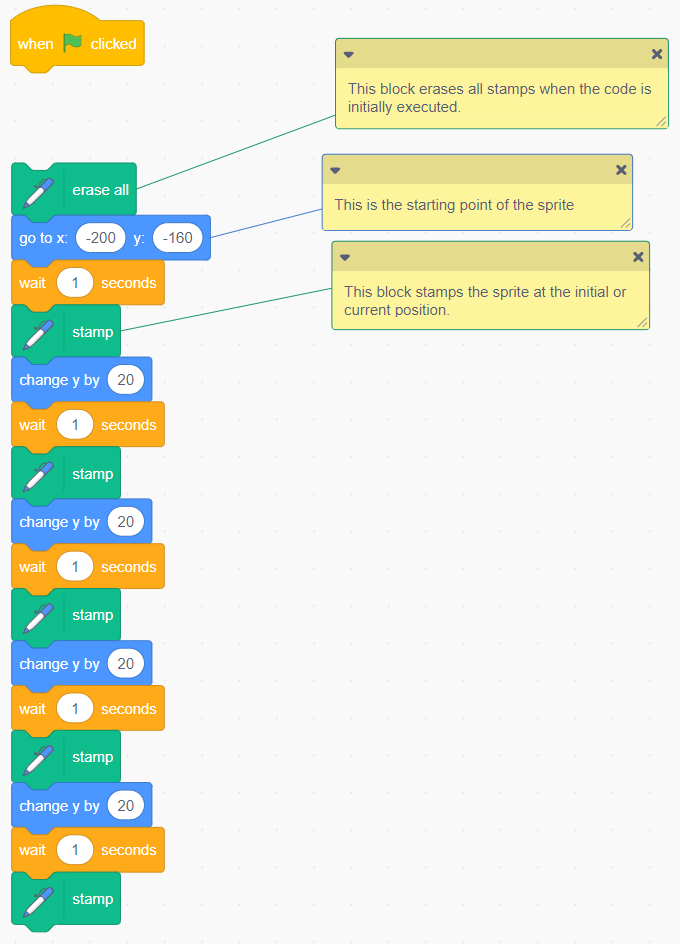Image Blocks of code: Events block stating “start on when green flag is clicked”. Pen extension stating “erase all” Caption: “this block erases all stapms when the code is initially executed”. Motions block stating “go to x: ‘-200’ y: ‘-160'. Caption: “This is the starting position of the sprite”. Pen extension stating “stamp” Caption: “This block stamp the sprite at the initial or current position”. Motions block stating “change y by ‘20’.” Controls block stating “wait ‘1’ second”. Pen extension stating “stamp” Motions block stating “change y by ‘20’.” Controls block stating “wait ‘1’ second”. Pen extension stating “stamp” Motions block stating “change y by ‘20’.” Controls block stating “wait ‘1’ second”. Pen extension stating “stamp” Motions block stating “change y by ‘20’.” Controls block stating “wait ‘1’ second”. Pen extension stating “stamp” Motions blocks stating “point in direction ‘90’.” Pen extension stating “pen down”. |