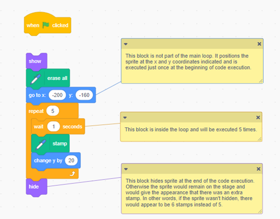 Image Blocks of code: Events block stating “start on when green flag is clicked”. Looks block stating “show”. Pen extension stating “erase all” Motions block stating “go to x: ‘-200’ y: ‘-160'. Caption: “This block is not part of the main loop. It positions the sprite at the x and y coordinates indicated and is executed just once at the beginning of the code execution. Controls block stating “repeat 5”. Inside are 3 nested blocks. Controls block stating “wait ‘1’ seconds. “This block is inside the loop and will be executed 5 times”. Pen extension stating “stamp”. Motions block stating “change y by ‘20’.” Looks block stating “hide”. Caption: “This block hides sprite at the end of the code execution. Otherwise, the sprite would remain on the stage and would give the appearance that there was an extra stamp. In other words, if the sprite wasn’t hidden, there would appear to be 6 stamps instead of 5.