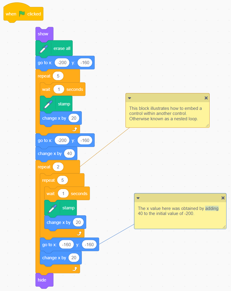 Image Blocks of code: Events block stating “start on when green flag is clicked”. Looks block stating “show”. Motions blocks stating “go to x: ‘-200’ y: ‘-160’.” Controls block stating “repeat 5”. Inside 2 nested blocks. Pen extension stating “stamp”. Motions block stating “change y by ‘20’.” Motions blocks stating “go to x: ‘-200’ y: ‘-160’.” Motions block stating “change x by ‘40’.” Controls block stating “repeat 2”. Caption: “This block illustrates how to embed a control within another control. Otherwise known as a nested loop”. Inside 4 nested blocks. Controls block stating “repeat 5”. Controls blocks stating “wait ‘1’ seconds”. Pen extension stating “stamp”. Motions block stating “change x by ‘20’.” Motions blocks stating “go to x: ‘-160’ y: ‘-160’. Motions blocks stating “change x by ‘20’.” Looks blocks stating “hide”. |