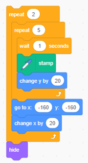 Image Controls block stating “repeat 2”. Inside 3 nested blocks. Controls block stating “repeat 5”. Inside 3 nested blocks. Controls block stating “wait ‘1’ seconds”. Pen extension stating “stamp’. Motions block stating “change y by ‘20’”. Motions blocks stating “go to x: ‘-160’ y: ‘-160’. Motions block stating “change x by ‘20’”.