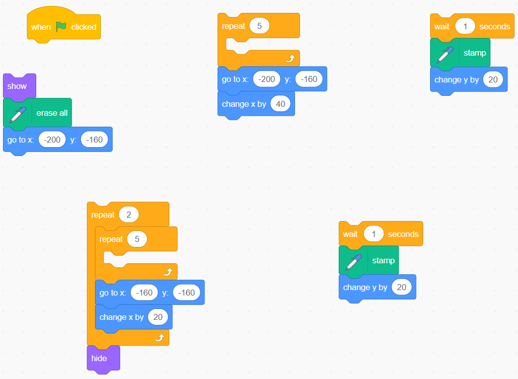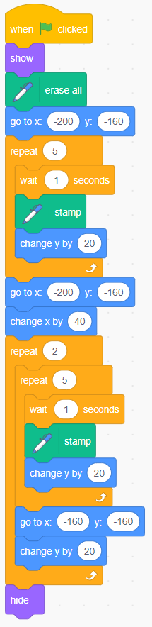Image Blocks of code: Events block stating “start on when green flag is clicked”. Looks block stating “show”. Pen extension stating “erase all”. Motions blocks stating “go to x:’-200’ y: ‘-160’.” Controls blocking “repeat 5”. Inside 3 nested blocks. Control blocks stating “wait ‘1’ seconds”. Pen extension stating “stamp”. Motions blocks stating “change y by ‘20’.” Motions blocks stating “go to x:’-200’ y: ‘-160’. Motions blocks stating “change x by ‘40’.” Controls blocking “repeat 2”. Inside 3 nested blocks. Controls blocking “repeat 5”. Inside 3 nested blocks. Controls blocking “repeat 1”. Pen extension stating “stamp”. Motions blocks stating “change y by ‘20’.” Motions blocks stating “go to x:’-160’ y: ‘-160’. Motions blocks stating “change x by ‘20’.” Looks block stating “hide”. |