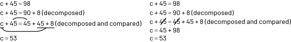 Image « c » plus 45 equals 98 « C » plus 45 equals 90 plus 8 « decomposed. » « c » plus 45 equals 45 plus 45 plus 8 « decomposed and compared» .« c » equals 53. A trait makes a link between « c » and 45 plus 8. « c » plus 45 equals 98. « C » plus 45 equals 90 plus 8 « decomposed. ». « c » plus 45 equals 45 plus 45 plus 8 « decomposed and compared. ». « c » equals 53. 45 is crossed out on each sign of the equality on the third line.