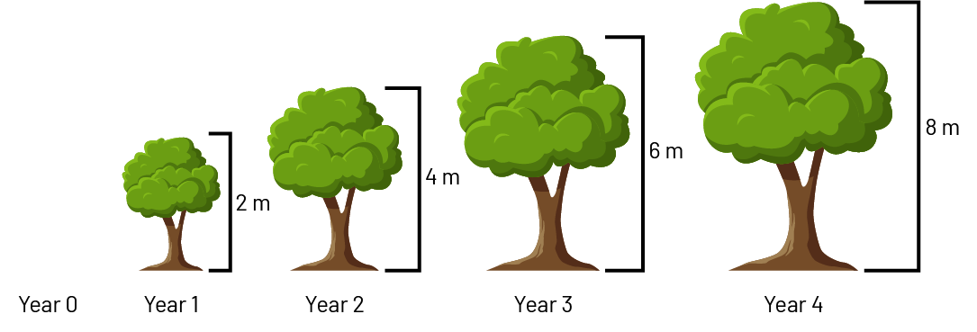 Image A term that shows tree growth in meters over 4 years. Year one, 2 meters. Year 2, 4 meters. Year 3, 6 meters. Year 4, 8 meters.