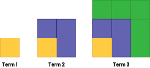 Image Non-numeric growing pattern of squares. Term one, one light blue square. Term two, one light blue square and 3 medium blue square. Term 3, one light blue square and 3 medium blue square, and 4 dark blue squares.