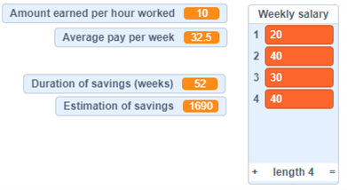 For the following entries: Money given per hour worked = $10 Number of weeks worked = 4 Hours worked per week = 2, 4, 3, 4 Savings period = 1 year or 52 weeks Image Coding window that show different variables; Amount earned per hour worked: ten. Average pay per week: 32.5. Duration of saving (weeks): 52. Estimation of savings: 1690. |