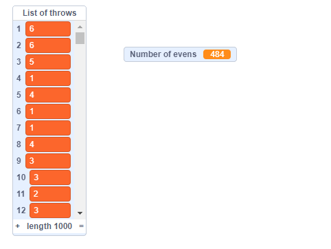 | The student repeats 1,000 times in their even number code rather than repeating the length of the list. | Ask the student where the results of the dice rolls are compiled (the results of the dice rolls should be compiled in "The Rolling List").